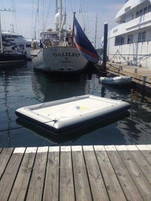 Плавучая платформа, которую можно закрепить. Изготовлен из материала, надувание и сборка занимает примерно 5минуты. Используется владельцами яхт и катеров, которым нужен быстрый и легкий доступ к своей лодке, а также для тех, кто поддерживает свою лодку в чистоте. Баллоны по периметру диаметром 30 см не дадут вашим инструментам скатится в воду.