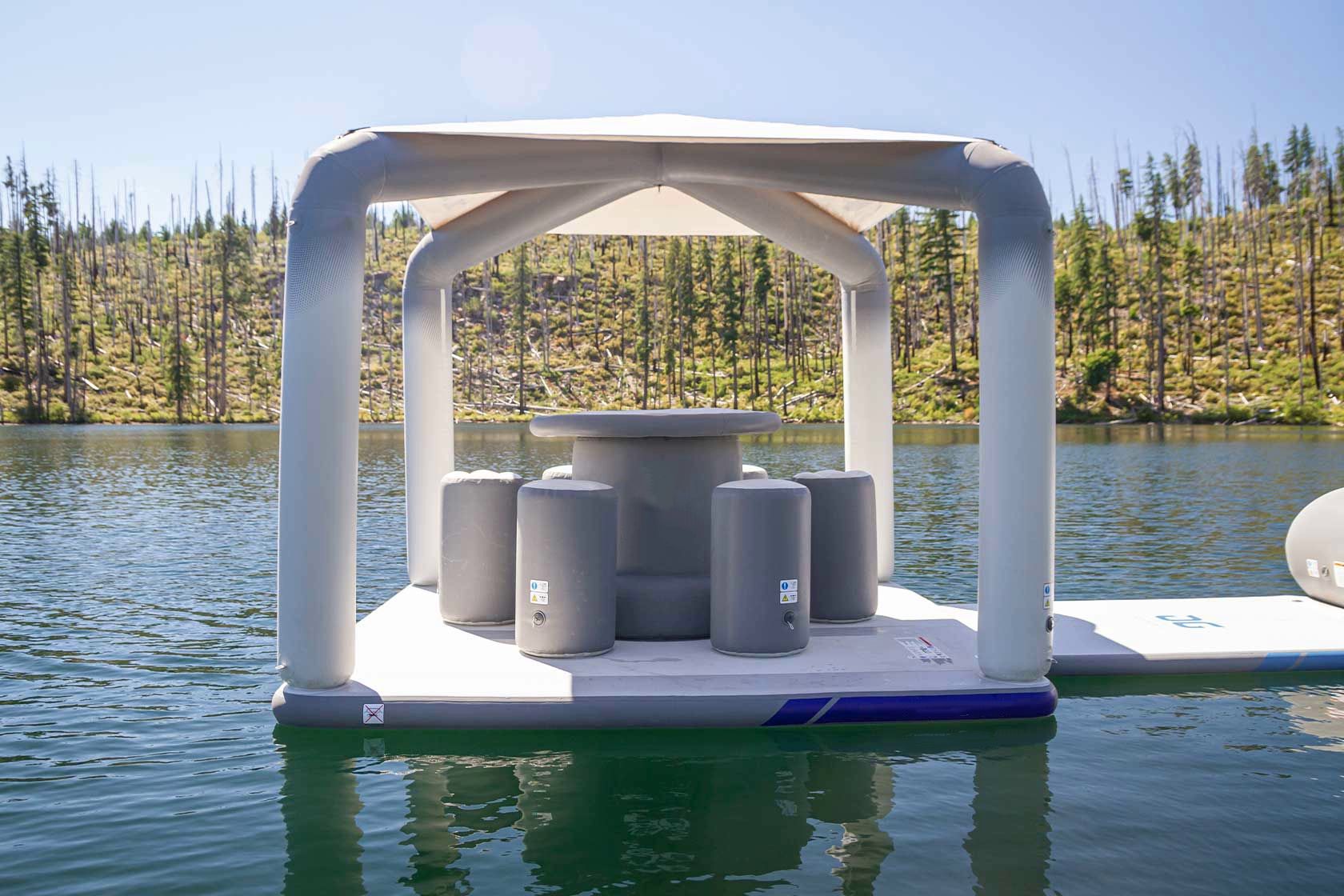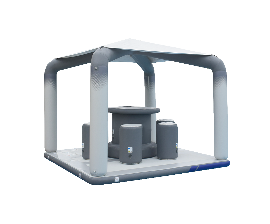 Надувной плот для отдыха с шестью сиденьями по типу барных стульев, приподнятым столом и натянутой крышей. Идеально подходит для организации отдыха.