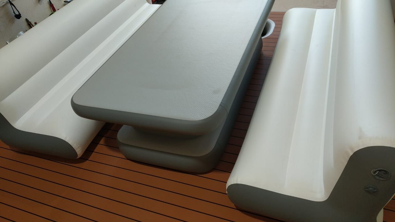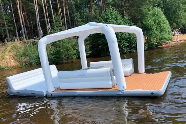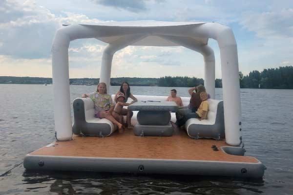 Надувной плот для отдыха с большим столом и натянутой крышей. Идеально подходит для организации отдыха.