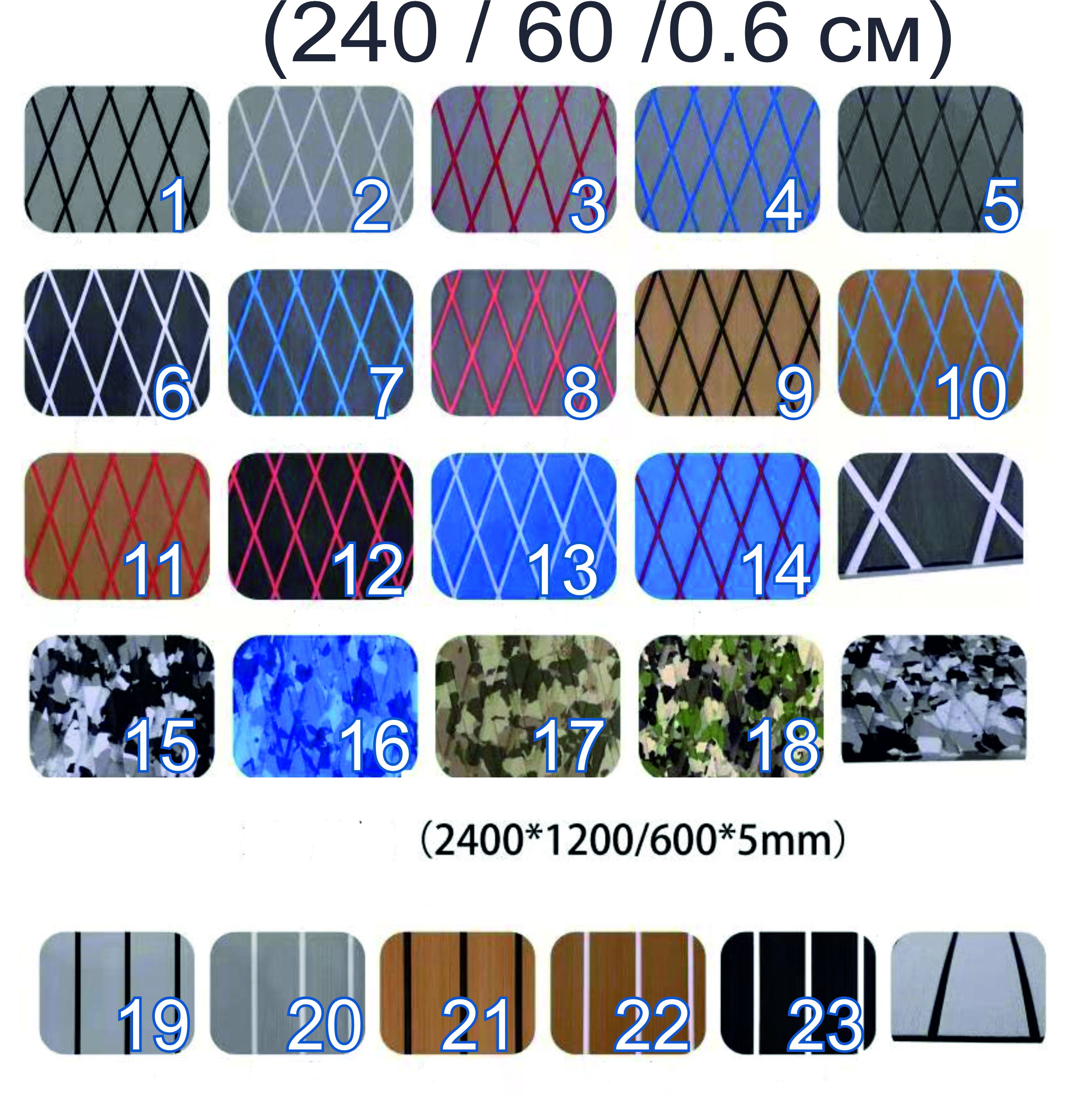 Лист искусственного тика EVA Deck - это новый популярный и простое в использовании напольное покрытие для лодки или палубы яхты или даже бассейна. Прочный и амортизирующий вы легко можете установить его сами он обеспечивает не только исключительную поверхность сцепления, но и снижает усталость, вызываемую длительным стоянием и работой на твердом настиле и платформах. Приглашаем связаться с нами, если вам нужна индивидуальная спецификация! * Цвета на фото были сняты камерой, пожалуйста, используйте стандартные товары. Размеры 240 х 60 х 0.5 см