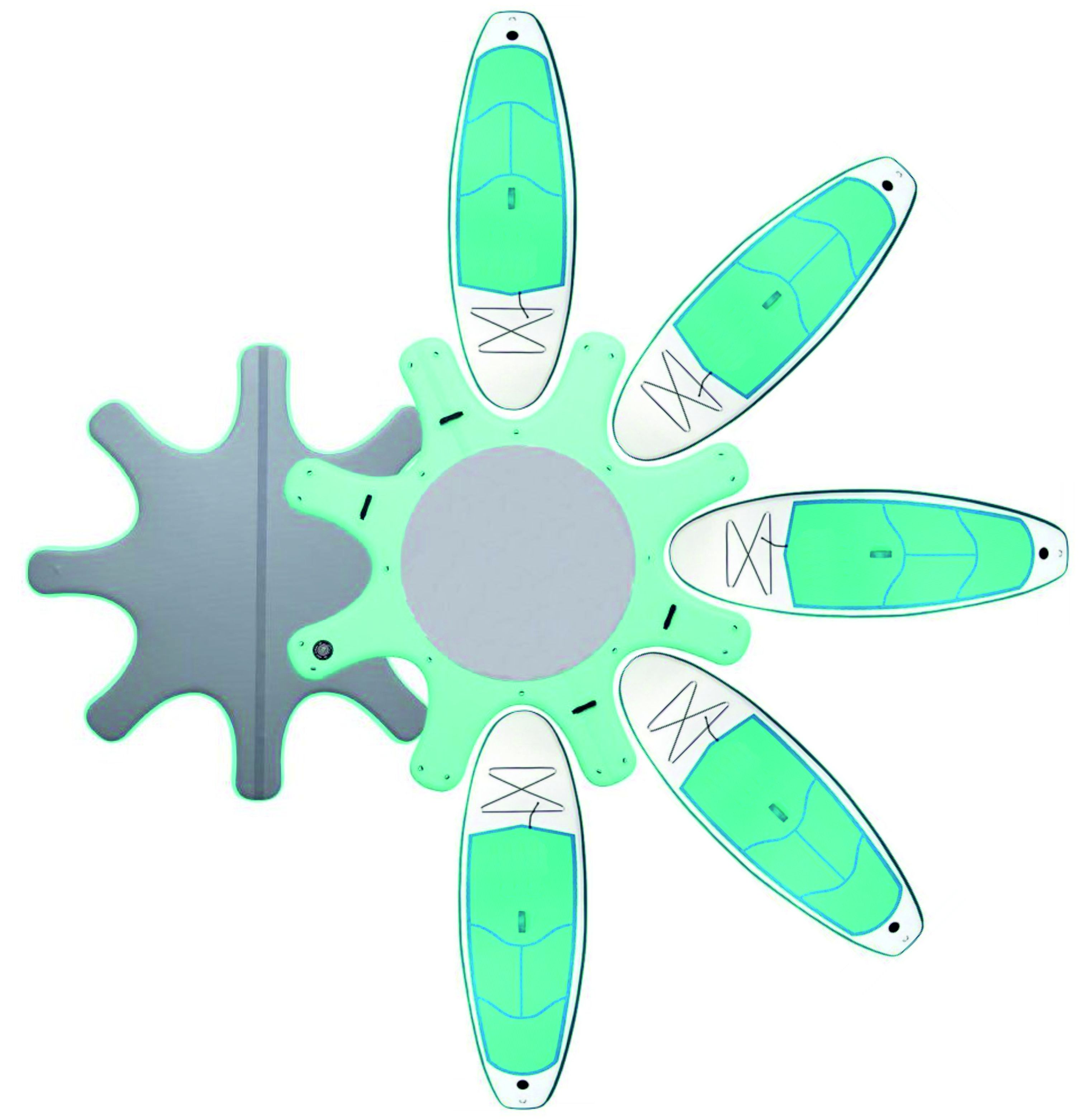Надувная платформа для проката и Фитнес-центров идеально подходит для любого типа занятий фитнеса или йогой. Он оснащен 16 крепежными D-кольцевыми разъемами на палубе, что позволяет разместить до 8 досок одновременно. Это действительно необходимо для SUP прокатов или школ водной йоги.